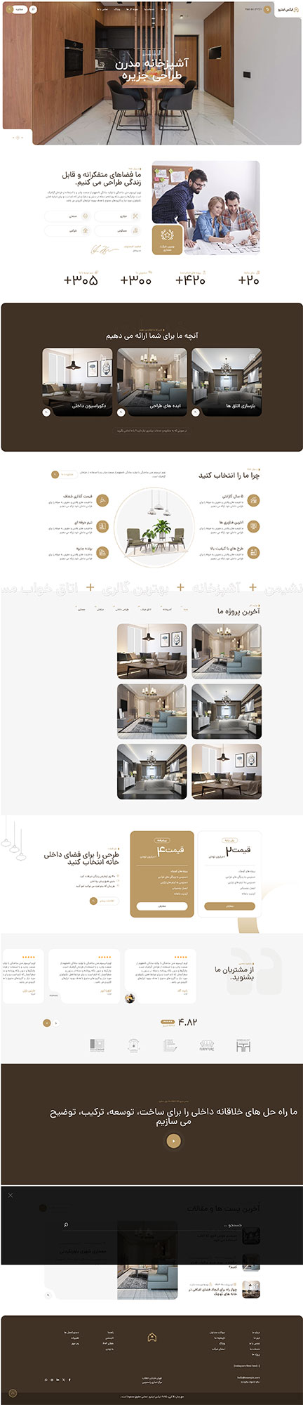 - لیست خدمات: طراحی مفهومی، نقشههای فاز یک و دو، نظارت بر اجرا، طراحی داخلی، بازسازی و...