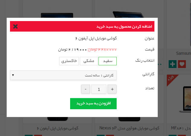 - امکان انتخاب رنگ، نوع گارانتی و تعداد جهت سفارش
